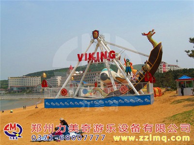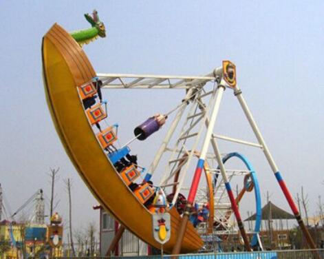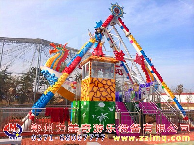 兒童游樂設備海盜船是一種全新設計的觀覽車類游藝機,是一種繞水平軸往復擺動的游樂項目,該種游藝機因造型圖同而名稱各異,“海盜船”因為其外形仿古代海盜船而得名。海盜船造型為美洲印第安部落風格,總高度7.2米,大擺角45度。