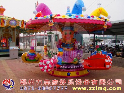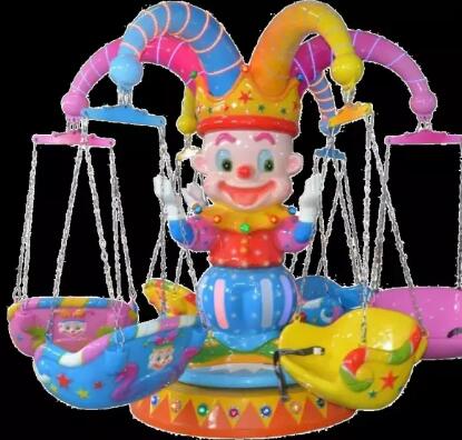 小丑飛椅在同類產品中,具有噪聲小和占地面積小的優點。不但具有性能優異,可靠等特點,而且還將以新穎美觀的造型、華麗迷人的彩燈裝飾,逼真刺激的音響效果,吸引眾多的游客。當乘客乘坐在正在運行的吊椅上時,伴隨逼真刺激的音樂效果,會有一種空中飛人的感覺,是公園、游樂園、青少年宮等單位一項很不錯游樂設施投資選擇。
