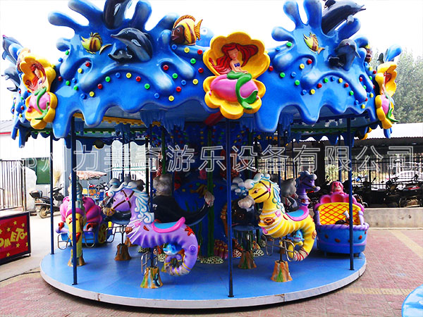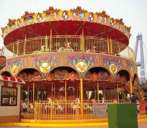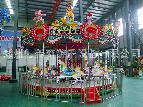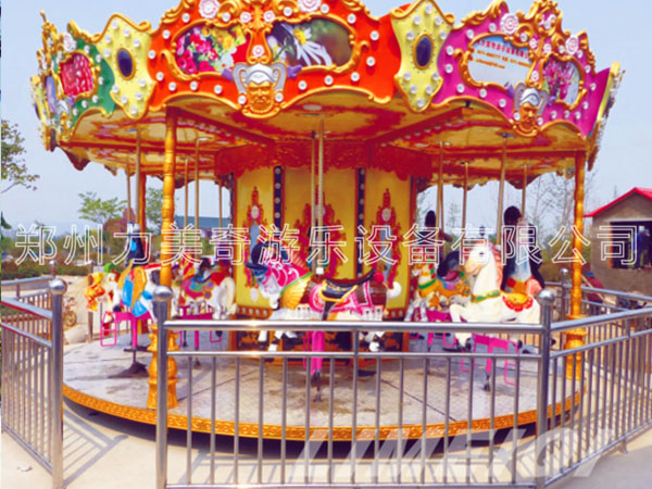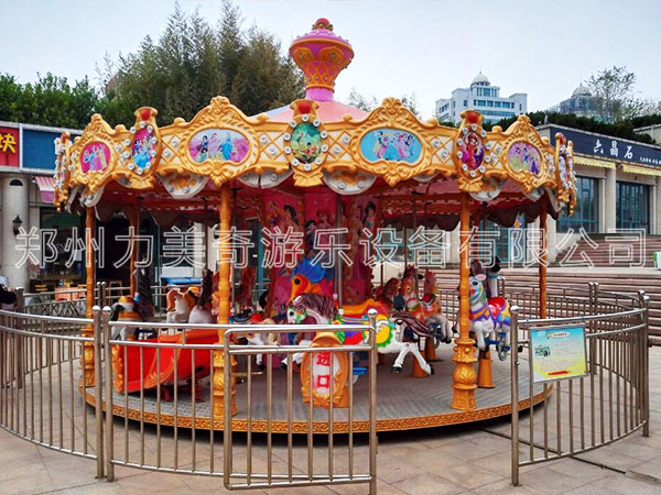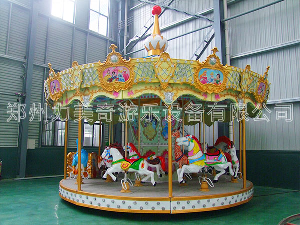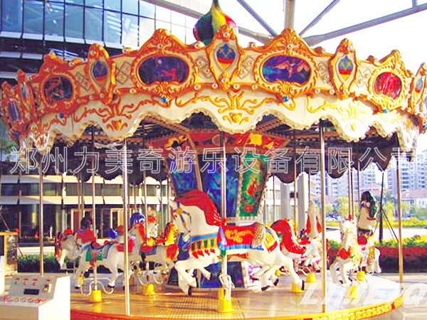 豪華轉馬,顧名思義就是豪華的旋轉木馬,它是一種垂直軸類單轉體起伏型游藝機,是模擬跑馬廳的娛樂活動而設計的,該游藝機的上部設有彩色的錐形頂棚,頂棚的周圈裝有五彩繽紛的玻璃鋼裝飾板,更顯豪華氣派,儼如華麗的跑馬廳。廳中央有起伏奔跑的大小馬群。設備啟動后,金光銀光,閃閃相映,馬群、馬車競相賽跑,形成一個萬馬奔騰的場面,乘客如同參加一場跑馬比賽,無不感到心感到心曠神怡,樂趣無窮!