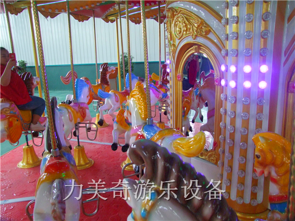 鄭州力美奇游樂設備有限公司生產的36座豪華轉馬,內外頂棚及中柱都采用了玻璃鋼材質,由無數匹馬兒、豪華馬車、小驢、鴕鳥、長頸鹿、鴕鳥、獅子等動物組成,頂部有華麗無比的皇冠。當夜幕降臨,五顏六色的燈光亮起,更顯現出它的豪華跟華麗,成為樂園很耀眼、受歡迎的焦點項目。