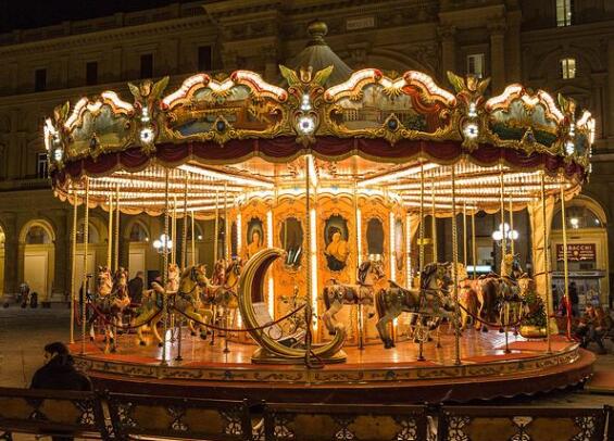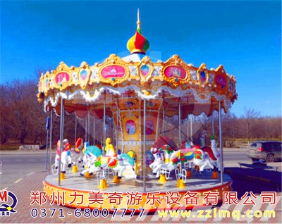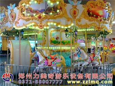 旋轉木馬或回轉木馬游樂場機動游戲的一種,即旋轉大平臺上有裝飾成木馬且上下移動的座位供游客乘坐。很早記錄的旋轉木馬出現于拜占庭帝國時期。約1860年歐洲出現排名靠前個以蒸汽推動的旋轉木馬。旋轉木馬成為每個大人孩子心中的童話世界不可缺少的裝飾,如今在各大小游戲場、商場等地方皆有各式旋轉木馬。